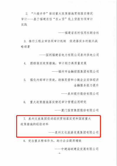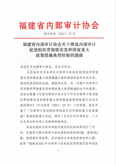 日前,福建省內部審計協會通報內部審計促進組織貫徹落實黨和國家重大政策措施典型經驗名單,以及2021年度內部審計理論研討獲獎情況,由泉州文旅集團提交的《泉州文旅集團促進組織貫徹落實黨和國家重大政策措施的經驗材料》被列入全省典型經驗材料,獲得“福建省2021年內部審計促進組織貫徹落實黨和國家重大政策措施典型經驗”稱號;由泉州文旅集團審計部撰寫的《淺議如何保障國有小股東在混合所有制企業中權益》榮獲全省內部審計理論研討三等獎。